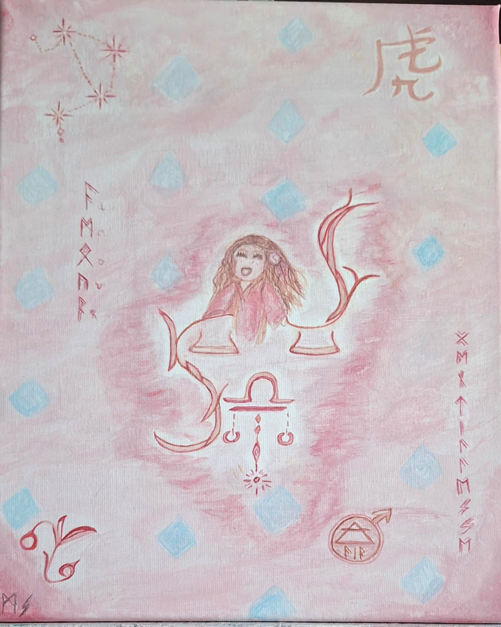 Peinture à mettre (âme-être), à exposer pour vous retrouver, pour révéler votre paix, votre quiétude émotionnelle, avec des symboles et l’écriture runique.