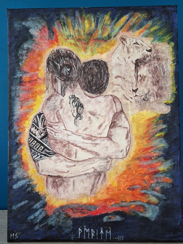 Peinture aquarelle et acrylique symbolisant le pardon à soi-même et aux autres. Personnalisée avec l’animal totem et lettres runiques.
