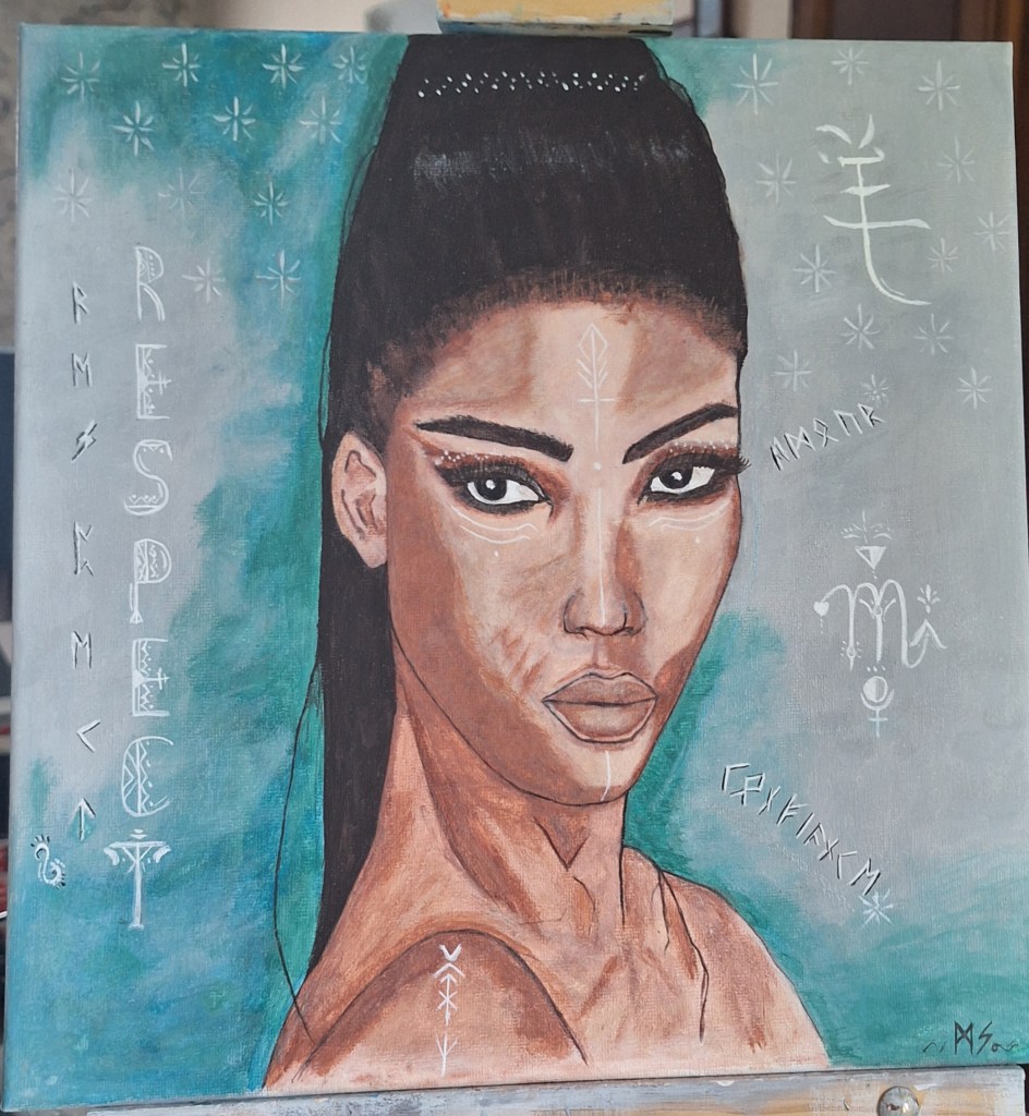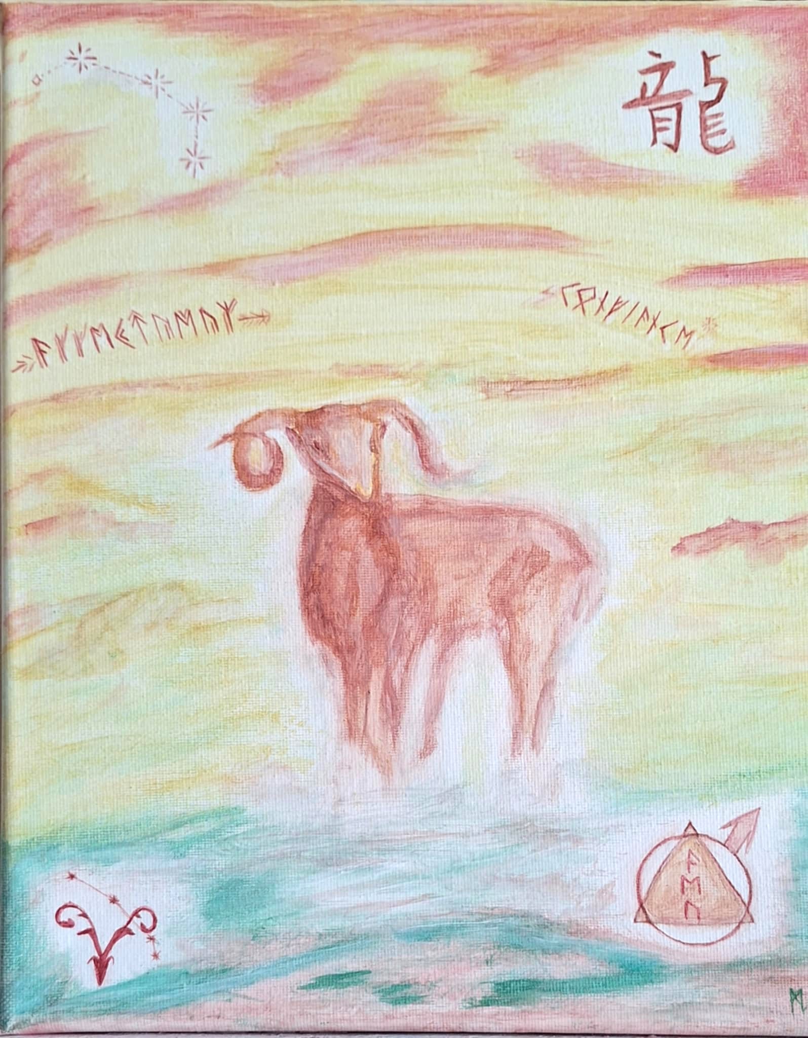 Peinture aquarelle et acrylique symbolisant le respect de soi, l’amour et la confiance en soi. Personnalisée avec un signe astrologique chinois et du zodiaque, lettres runiques.