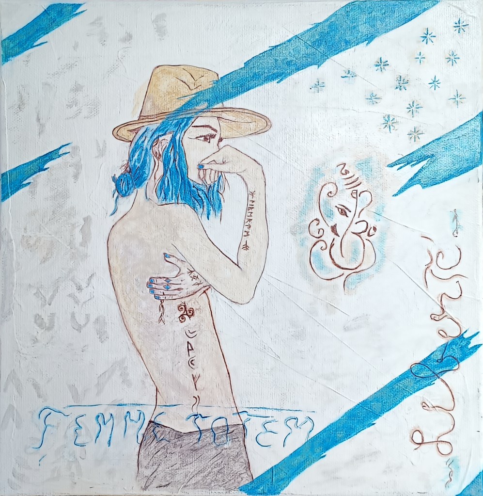 Peinture aquarelle symbolisant l’acceptation de soi. Personnalisée avec des tatouages et symbole spirituel.