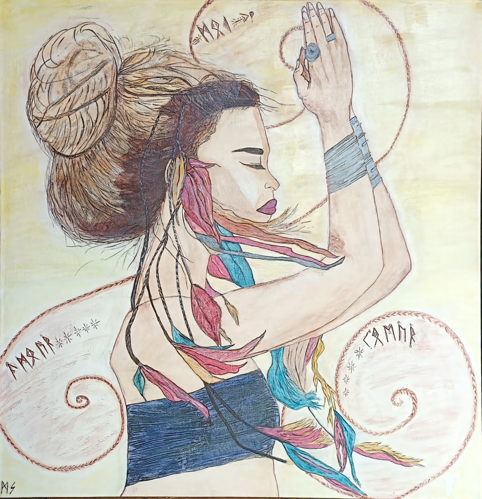Peinture aquarelle symbolisant l’amour de soi. Personnalisée avec les symboles spirituels du triskèle et des lettres runiques.
