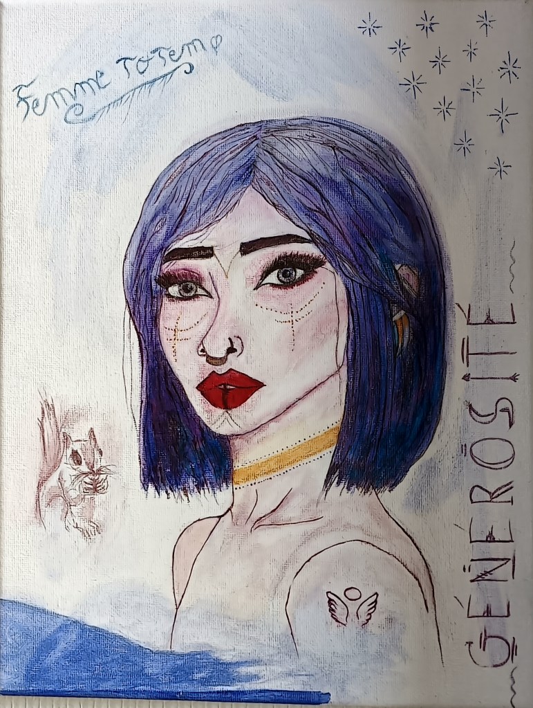 Peinture aquarelle symbolisant l’originalité et la générosité. Personnalisé avec l’animal totem, les tatouages .