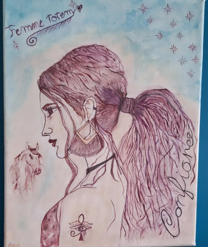 Peinture aquarelle symbolisant la confiance et détermination. Personnalisée avec l’animal totem et tatouage.
