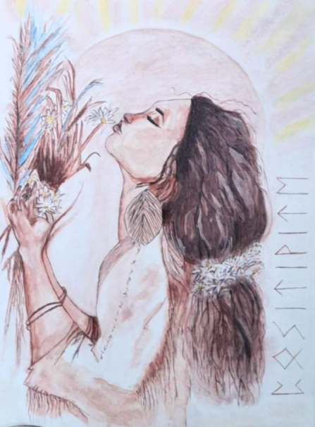 Peinture aquarelle symbolisant la positivité, l’élan naturel de la vie. Personnalisé avec les rayons du soleil, les fleurs et les lettres runiques.