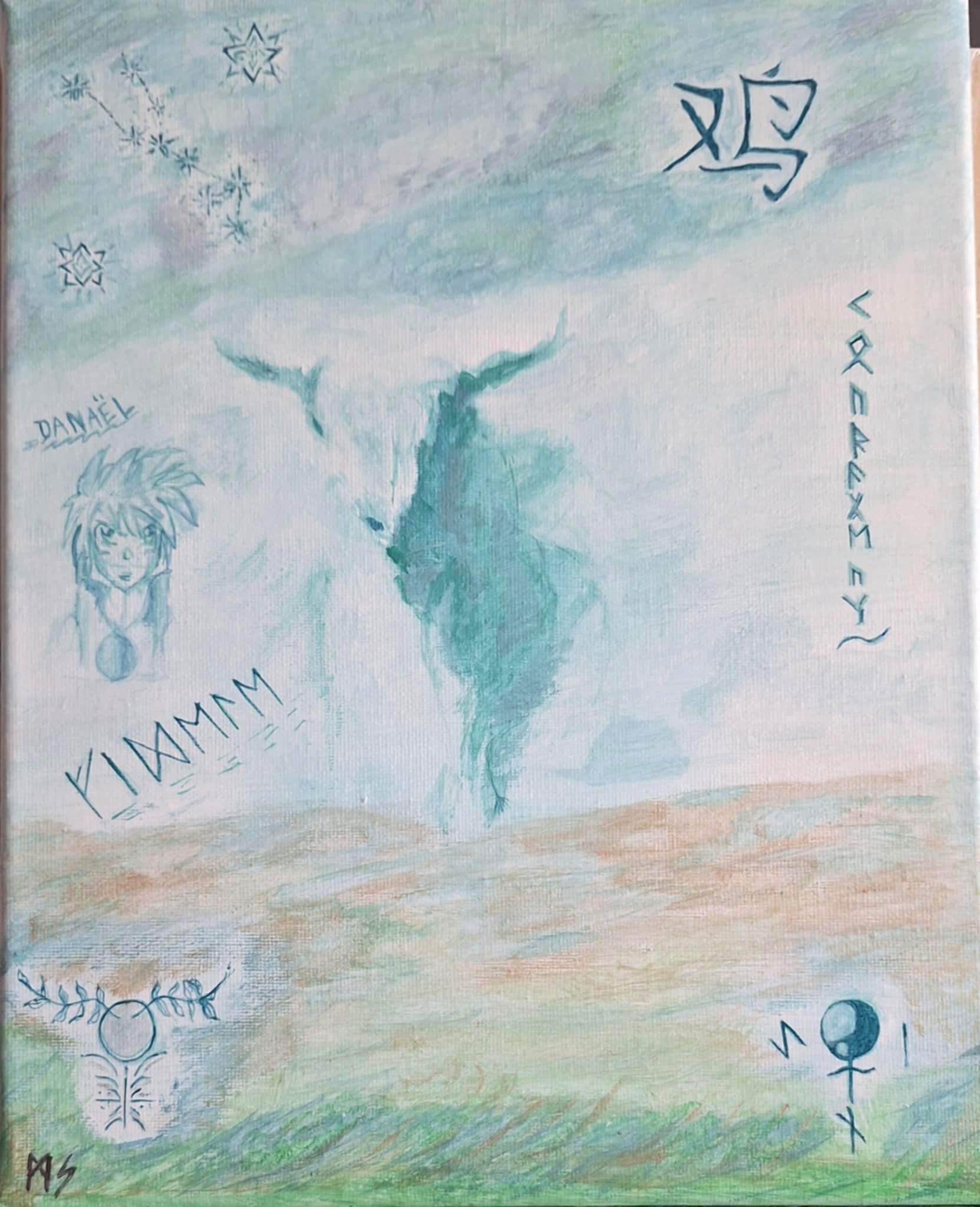 Peinture aquarelle et acrylique avec en symbolique le chakra du cœur, l’apaisement ; et écriture runique.