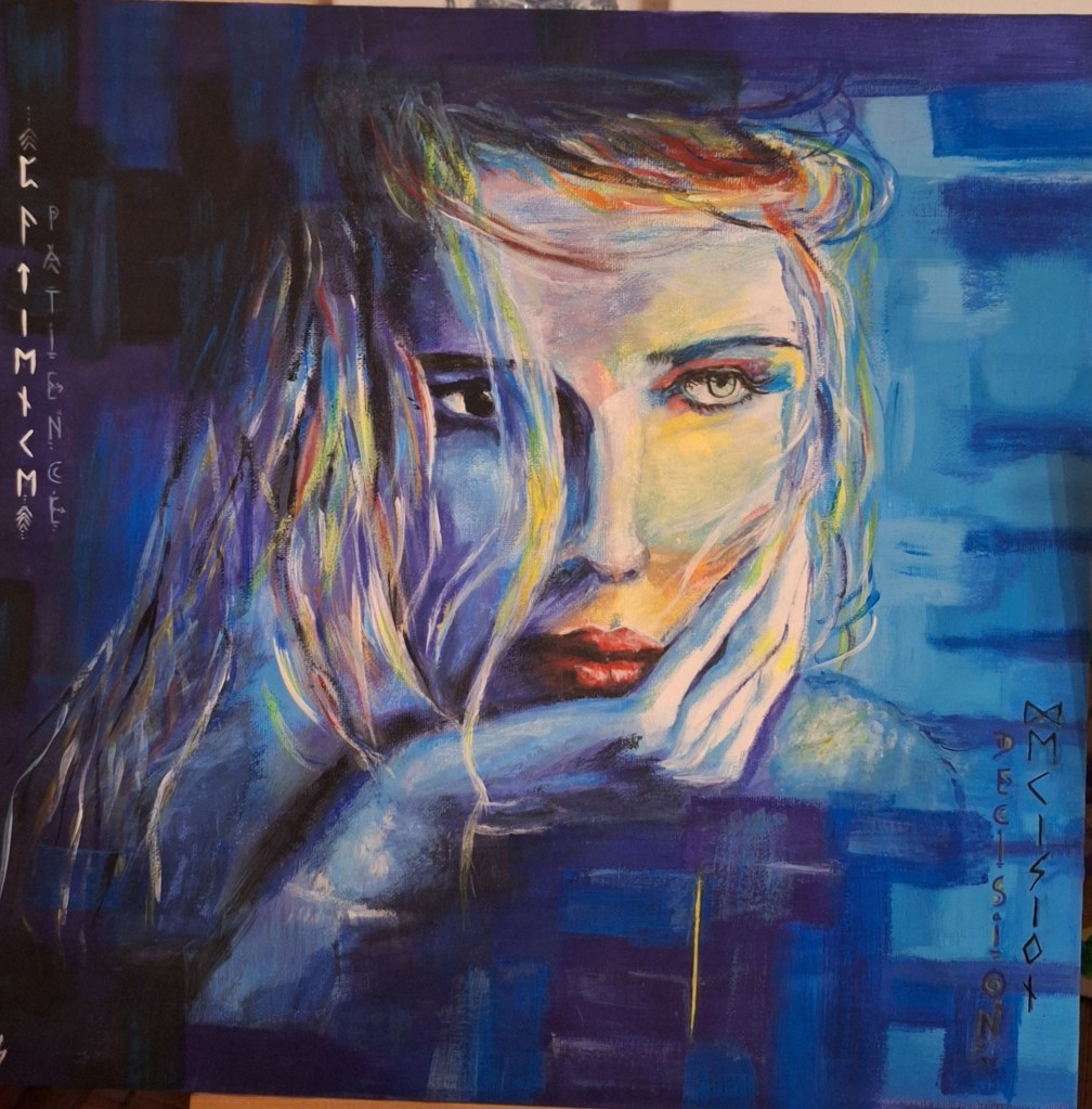 Peinture aquarelle symbolisant la réflexion, la patience, décision, regard tourné vers la lumière. Personnalisée avec l’écriture runique + rune Isa.